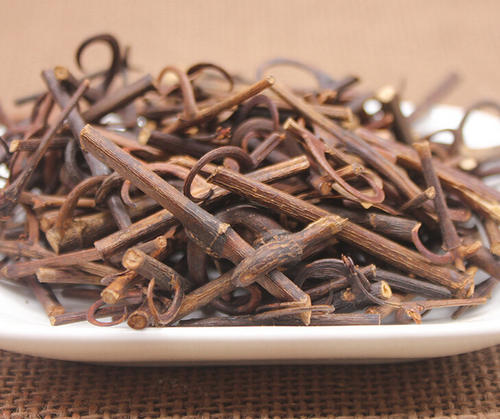钩藤,中药名,为茜草科植物钩藤、大叶钩藤、毛钩藤、华钩藤或无柄果钩藤的干燥带钩茎枝。本品茎枝呈圆柱形或类方柱形,长2~3cm,直径0.2~0.5cm。表面红棕色至紫红色者具细纵纹,光滑无毛;黄绿色至灰褐色者有的可见白色点状皮孔,被黄褐色柔毛。多数枝节上对生两个向下弯曲的钩(不育花序梗),或仅一侧有钩,另一侧为突起的疤痕;钩略扁或稍圆,先端细尖,基部较阔;钩基部的枝上可见叶柄脱落后的窝点状痕迹和环状的托叶痕。质坚韧,断面黄棕色,皮部纤维性,髓部黄白色或中空。气微,味淡。