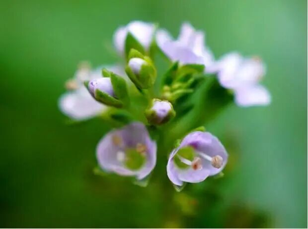 【形状】一年或二年生草本,全体无毛,或于花柄及苞片上稍有细小腺状毛。茎直立,高达25~90厘米,富肉质,中空,有时基部略倾斜。叶对生;长圆状披针形或长圆状卵圆形,长4~7厘米,宽8~15毫米,先端圆钝或尖锐,全缘或具波状齿,基部呈耳廓状微抱茎上;无柄。总状花序腋生,长5~15厘米;苞片椭圆形,细小,互生;花有柄;花萼4裂,裂片狭长椭圆形,先端钝;花冠淡紫色或白色,具淡紫色的线条;雄蕊2,突出;雌蕊1,子房上位,花柱1枚,柱头头状。蒴果近圆形,先端微凹,长度略大于宽度,常有小虫寄生,寄生后果实常膨大成圆球形。果实内藏多数细小的种子,长圆形,扁平;无毛。花期4~6月。