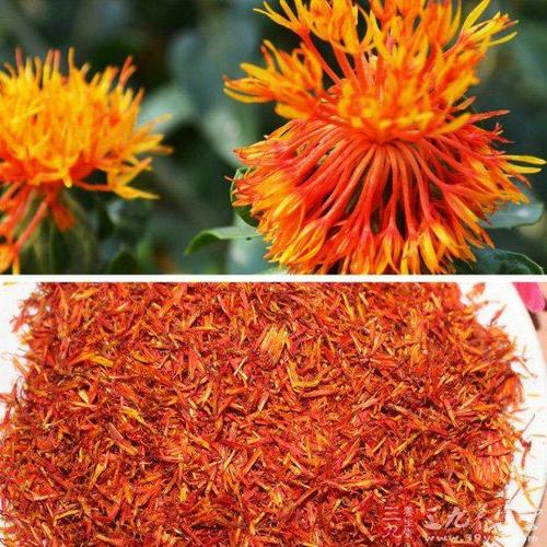 为菊科二年生草本植物红花的筒状花冠。产于河南、湖北、四川、云南、浙江等地,均为栽培。夏季开花,当花色由黄转为鲜红时采摘,阴干。性味归经:味辛,性温。归心、肝经。