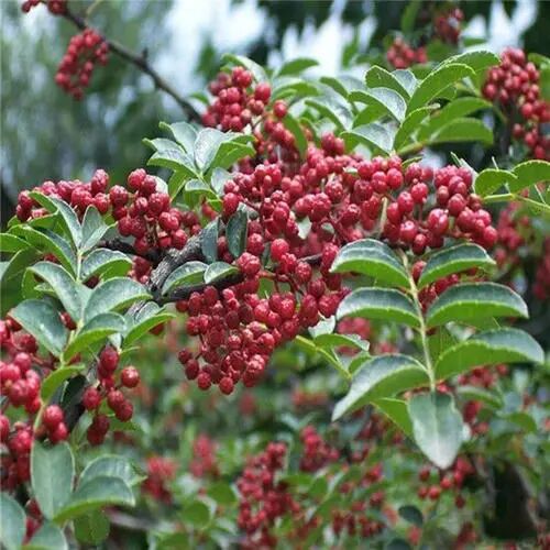 【生境分布】灌木,高1-3米。生于山坡及林灌木丛中,有栽培。树皮暗灰色,疏生平直而尖锐的刺。单数羽状复叶互生,叶轴具窄翼,具稀疏而略向上的小皮刺,小叶5~10片卵形或卵状披针形,边缘有细小圆齿,叶脉上有时生长刺。花小,淡绿色。瞢果球形,熟时暗红色,表面有众多瘤状突起,嗅之有浓烈的辛香味。种子黑色,有光泽(椒目)。秋季采成熟果实,哂干。