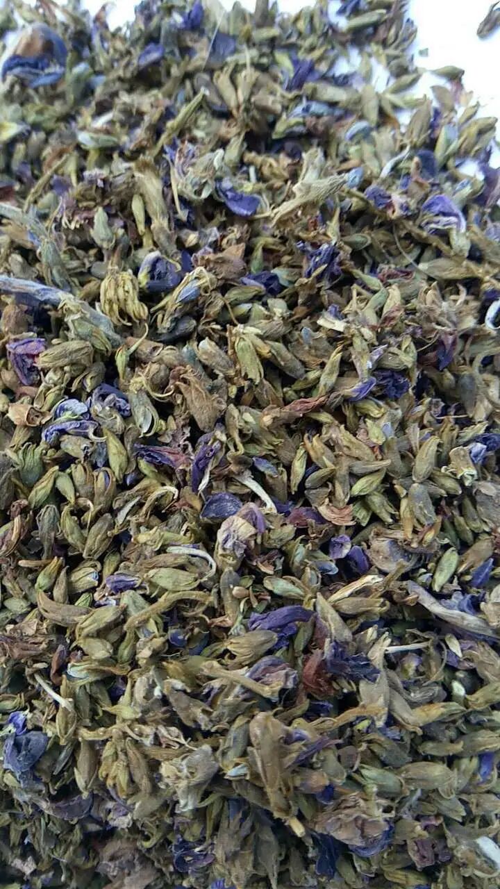 中药识别: 花蕾呈不规则的扁长圆形。萼片灰绿色,基部连合,先端5齿裂,裂片披针形,其中2齿合生,表面密被黄白色毛茸。花瓣5片等长,突出于萼外或被花萼包被,蓝紫色,外部颜色较浅,呈淡蓝紫色或淡棕色。雄蕊10枚,其中9枚连合,雌蕊细长,微弯曲,外面被毛。
