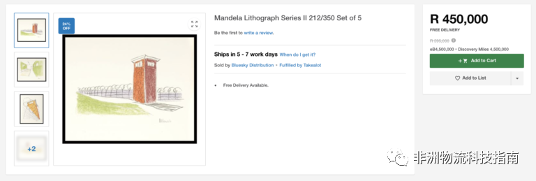 在Takealot上面能够找到这么贵重的物品,着实惊掉了小编我的下巴。这幅版画在 Takealot 上的存在很奇怪,因为这些类型的物品通常在大型拍卖会上或通过著名的画廊出售。在电商网站上出售这种价格昂贵的艺术品并不常见,对于电商网站的常规交付渠道并不能够符合这类产品的运输和交付。因为艺术品的印刷品和真品证书通常是分开运送的,如果艺术品被盗或者被抢,小偷也没有证书,转手会十分困难。