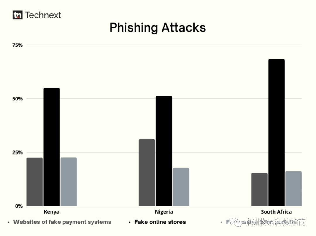 在肯尼亚,22.5%的攻击来自虚假支付系统网站,54.9%的攻击来自虚假网店,22.6%的攻击来自虚假网上银行门户。在尼日利亚,31.1%的人通过虚假支付系统网站支付,51.2%的人通过虚假网上商店支付,17.8%的人通过虚假网上银行门户网站支付。