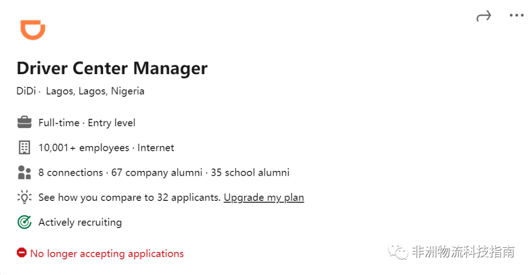 国内网约车巨头网约车DIDI公司可能很快就会在尼日利亚上线。尽管公司尚未发布官方声明,但这份尼日利亚拉各斯州司机中心经理的JD已经透露出了这家网约车巨头出海非洲的意图。