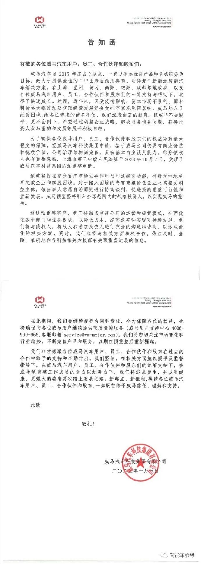 官博也发布了一份告知函,声称威马已经申请了预重整,并且法院也在10月7日受理。