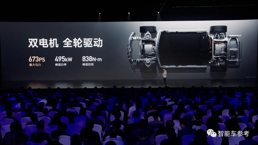 除了低风阻,小米SU7的高性能更多体现在,双电机版本最大马力673匹,峰值功率495kW,峰值扭矩838N·m。