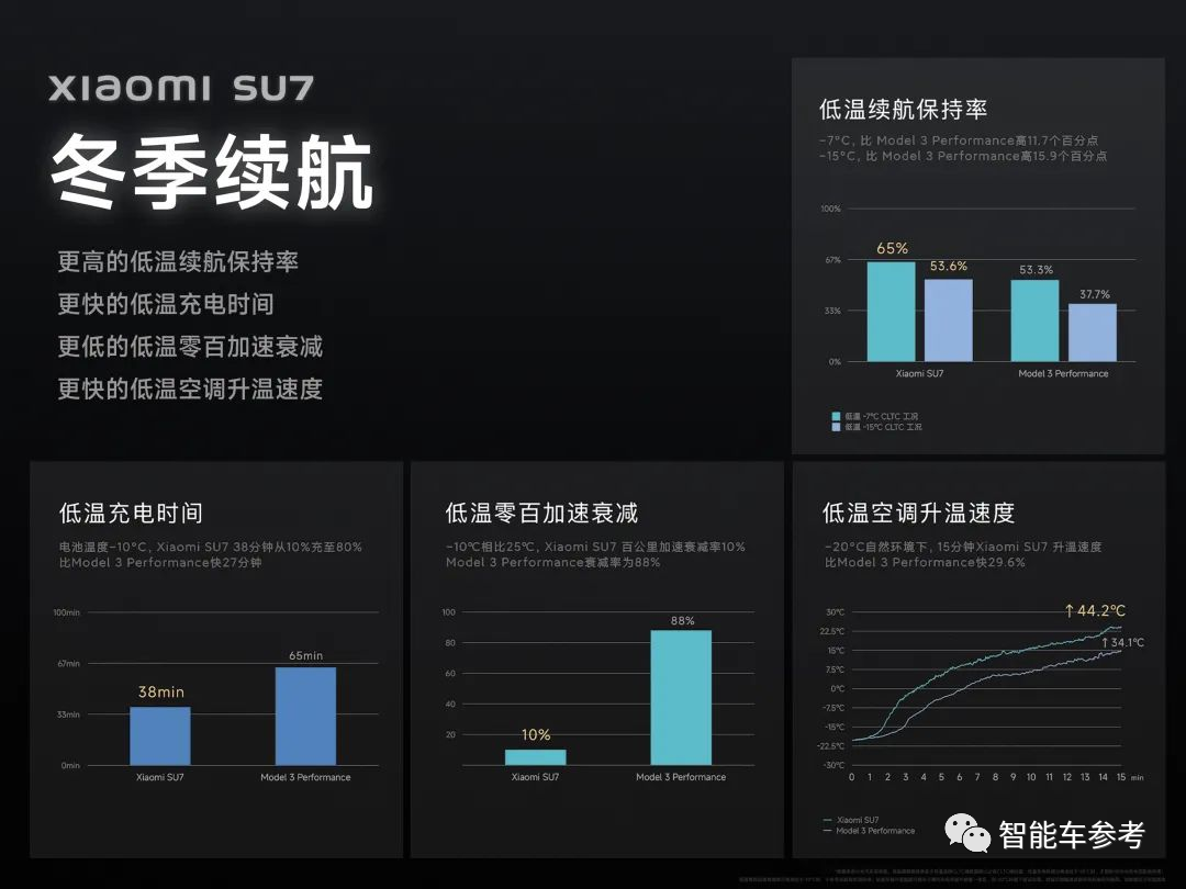 并且,雷军表示小米SU7还实现更高的低温续航保持率、更快低温充电速度,还有更快的低温空调升温速度,以及更低的低温动力性能衰减。