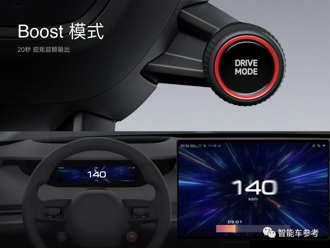 还额外增加Boost模式,在加速超车时,按下红色按键整车可立即提速,提供持续20秒的超额扭矩输出。