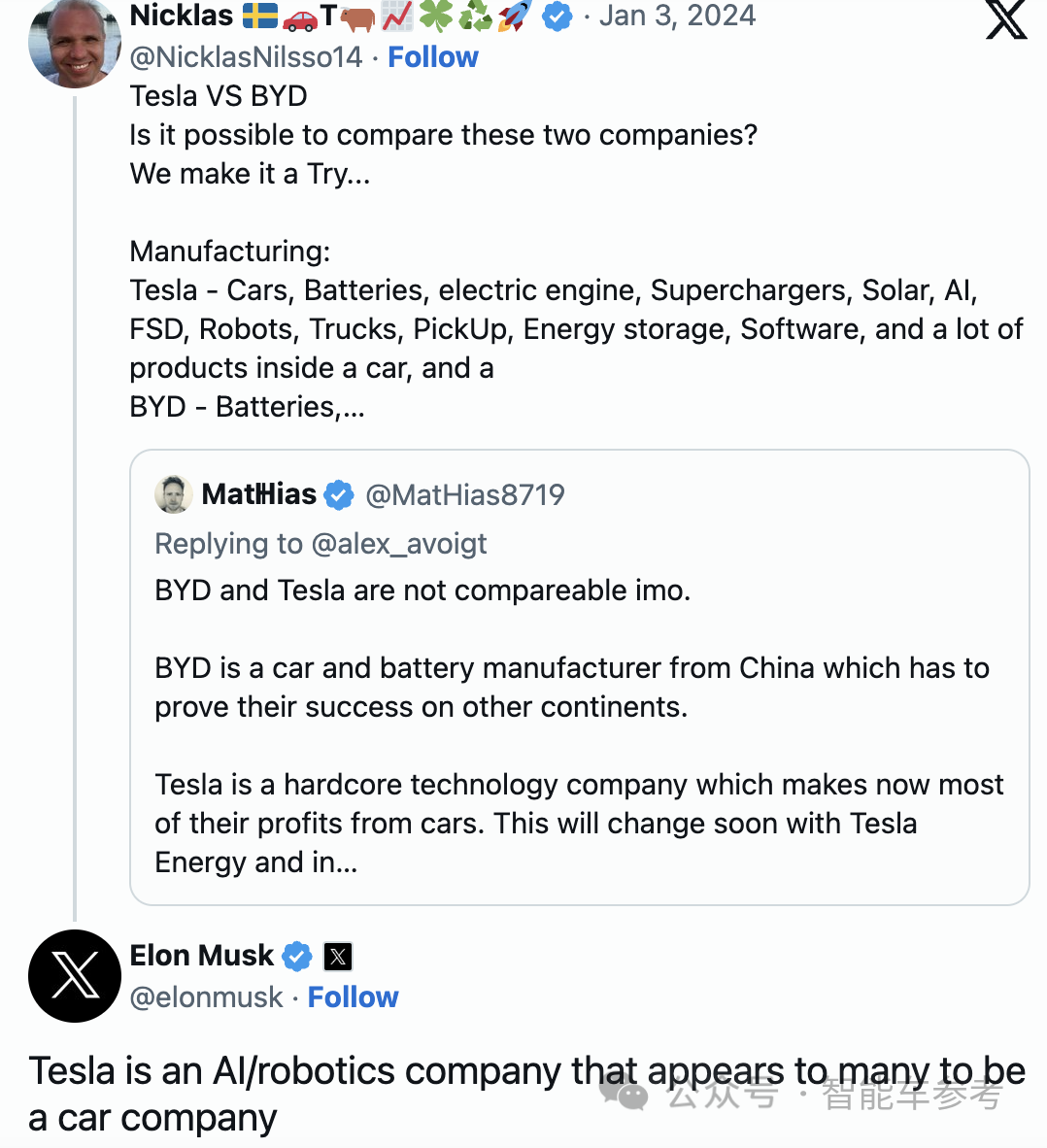 比亚迪是一家车企/电池供应商,而特斯拉则是一家AI科技公司,只不过目前大部分利润来自汽车罢了。