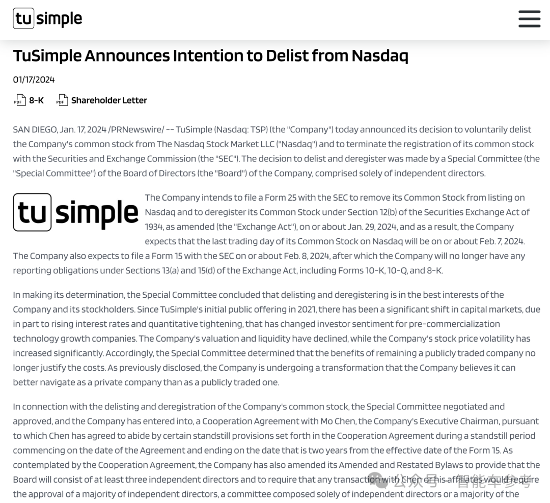 同时,图森还将在2月8日向SEC提交报告,从此不再拥有主动披露报告的义务。