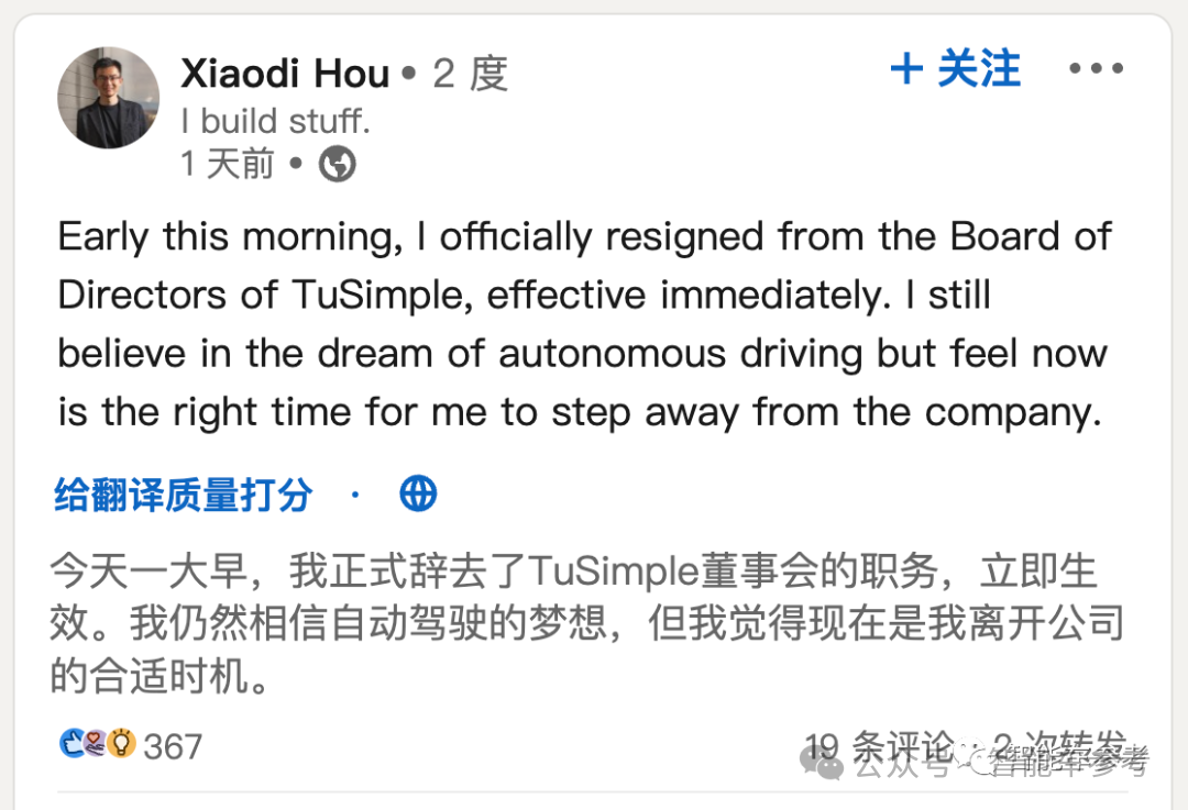 在图森提交报备高层人事变动的8-K的表格后,侯晓迪突然爆料,自己出走的原因之一是当时的管理层希望图森转型做L2级智能驾驶,和自己的意愿存在分歧。