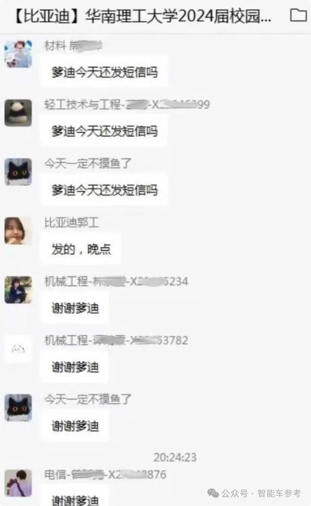 走出多位汽车大佬的华南理工大学,晚上八九点钟,毕业生还在校招群里向比亚迪负责人询问录用情况,齐刷刷地刷起“爹迪”: