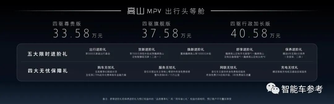 魏牌高山DHT-PHEV,全系四驱MPV,3085mm轴距,超5米车长,价格区间为33.58-40.58万元,纯电续航140km,百公里馈电油耗7.2L。