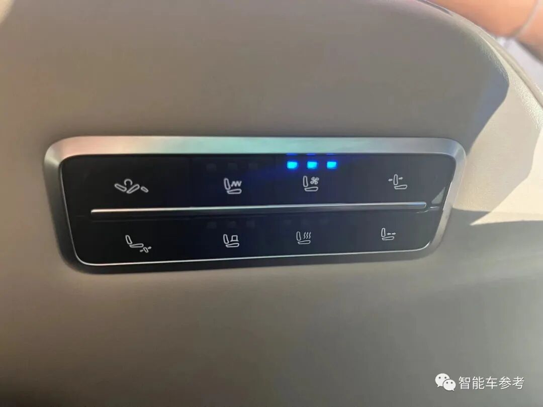 二排零重力座椅的八个按键还支持一键躺平,调节座椅靠背和腿托,开启座椅通风,加热,按摩。