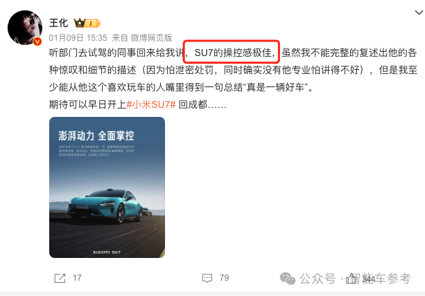 小米公关总经理王化引述参与测试同事的话称,小米SU7车辆“操控感好”。
