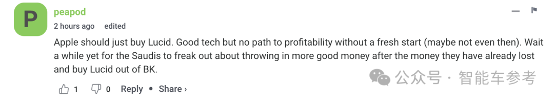 还有网友给苹果支招,现在那么多汽车公司买一个不就完了,比如拥有好技术但是还在亏损的Lucid(Lucid:Thanks bro),就应该直接收购。