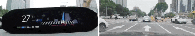 广汽ADiGO PILOT智驾系统能够精确识别实时路况,在交互仪表上没有直接显示出占道的栅栏,但能看到系统立刻重新识别了道路可通行范围: