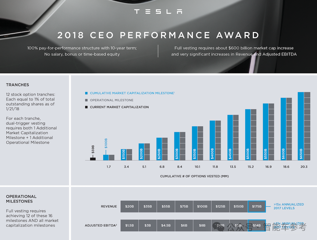 2018年,特斯拉董事会给马斯克制定了“十年薪酬方案”,当时特斯拉的市值大约是500亿美元,方案规定12个递进的特斯拉市值目标,对应12笔股票期权。