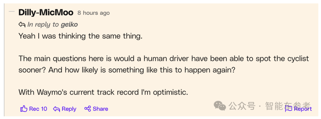 同样还有支持派表示,这起事故的主要问题是如果是人类司机驾驶车辆,能比Robotaxi更快发现骑车人吗?未来再次发生类似事件的可能性有多大?