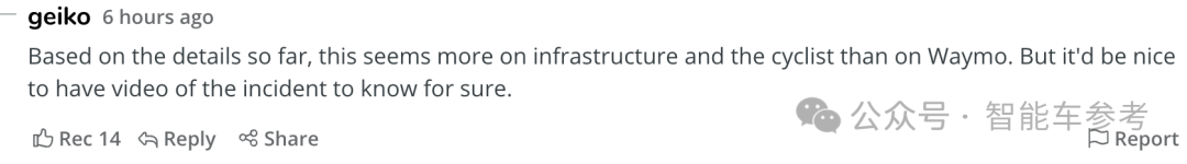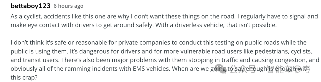 有网友表示,同样作为骑自行车出门的人,这就是他认为不应该让Robotaxi出现在公共道路上的原因。如果是人类驾驶的车辆,他还能通过和司机交流互动保证安全出行,而对于Robotaxi来说这是不可能的。