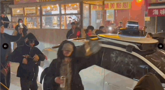 人群包围了这辆Robotaxi,有人在车身上涂鸦,有人开始破坏后排玻璃。