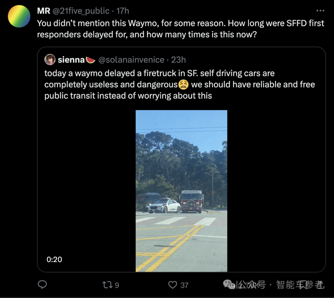 还有人在拿以前Waymo的Robotaxi妨碍消防车前进说事,“自动驾驶的车辆完全没有用并且很危险”。