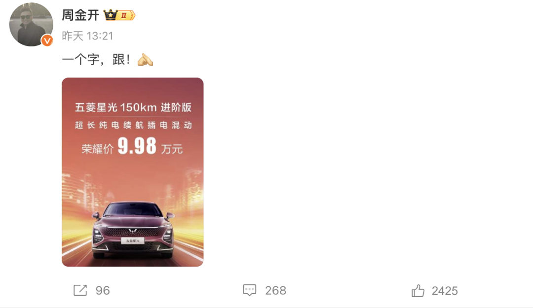 对于此次降价,五菱副总经理周金开发表微博,只说了“一个字”,却态度明确: