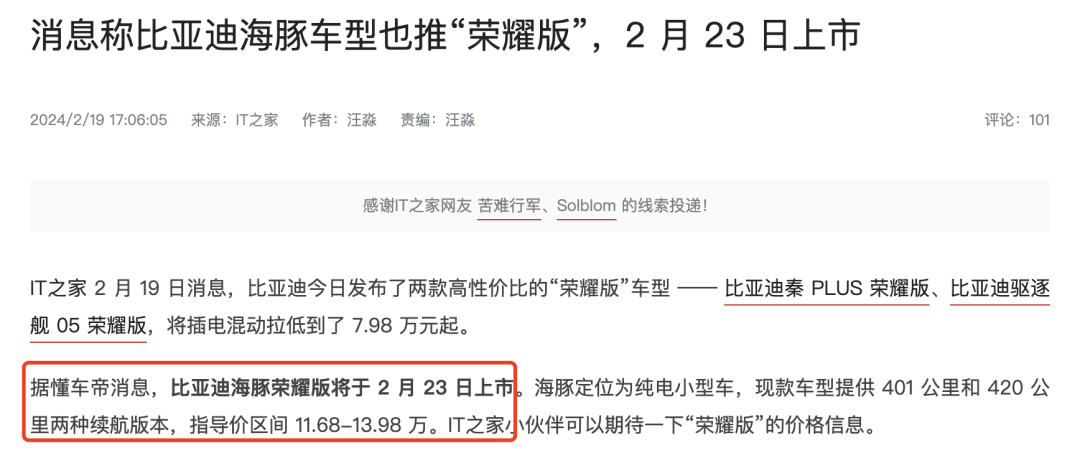 目前已有消息称,比亚迪海豚荣耀版将在2月23日上市。
