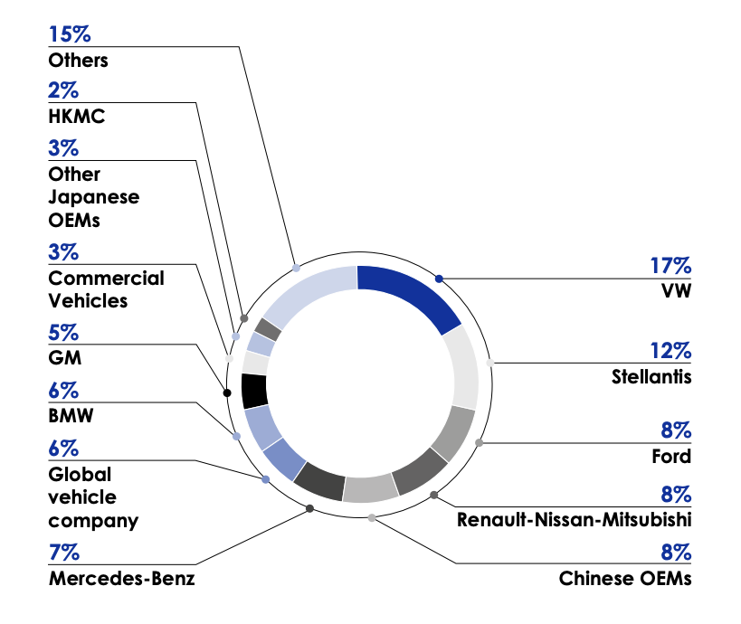 集团合作客户里基本都是熟面孔,大众、Stellantis、福特、雷诺-日产-三菱联盟、奔驰、通用等等,也包括中国车企,销售额占比8%,排在前五。