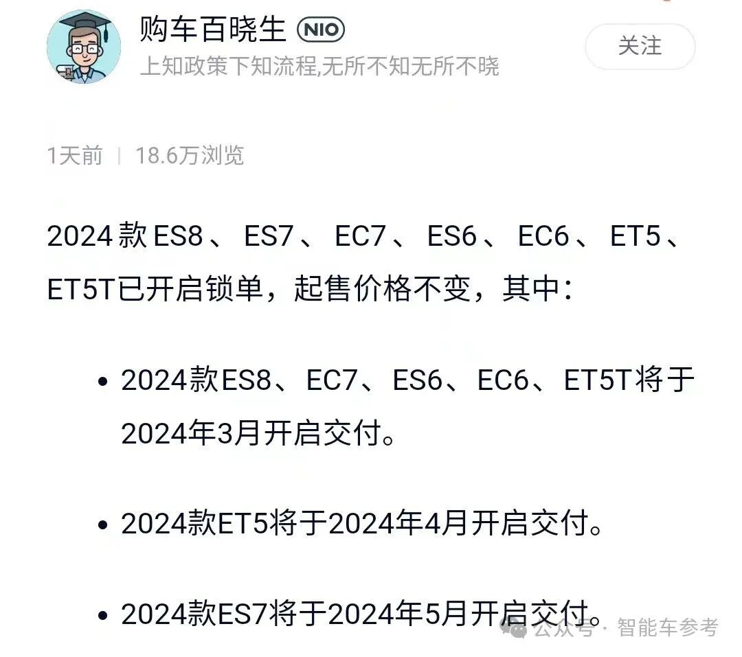 另外,蔚来大部分2024款车型已公布售价和改款信息,ES8、ES7、EC7、ES6、EC6、ET5和ET5T的起售价均不变,除座舱升级外其余均是配置方面的小改款,从3月开始陆续交付。