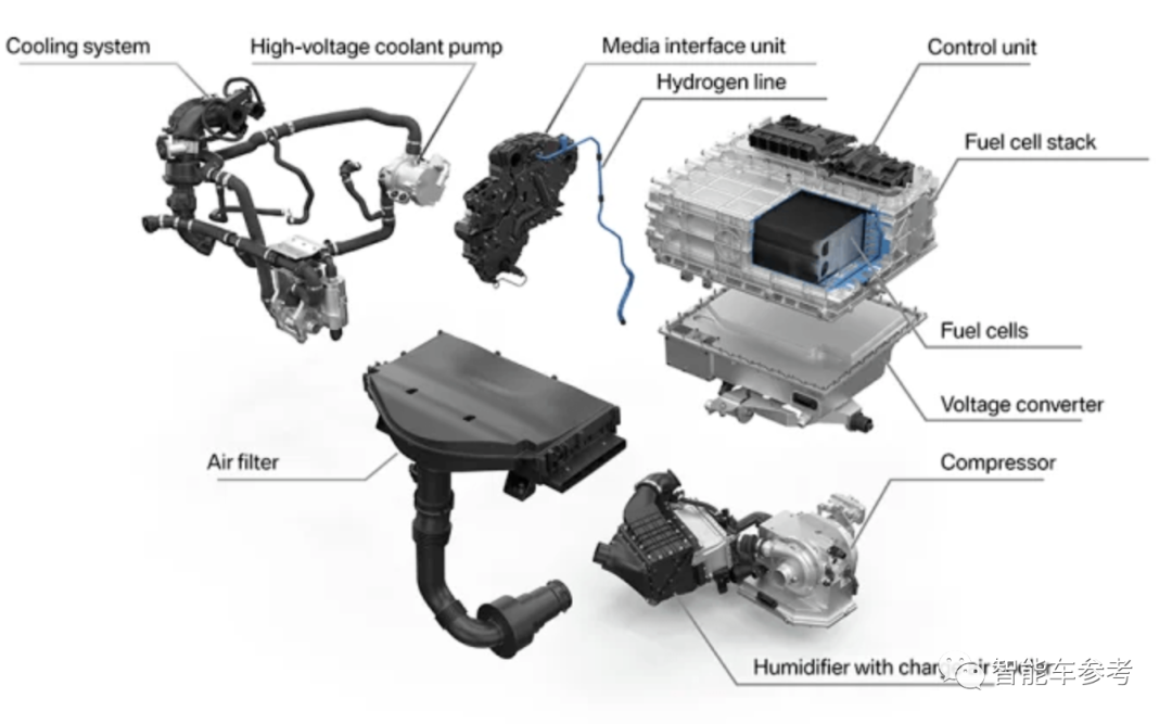 一些组件很熟悉,和燃油车一样,比如空滤、冷却、“油泵”等等,其实可以看成一个发动机,而燃料是氢气。