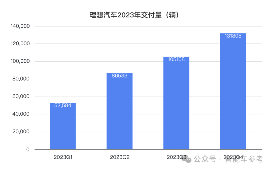 交付量再次刷新最好成绩,四季度交付131805辆,同比大涨184.6%,环比增长25.4%。