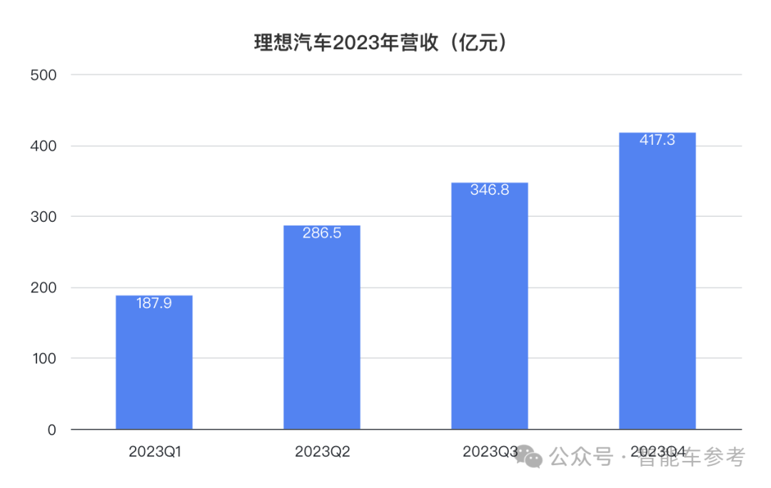 这让理想汽车单季度营收首次突破400亿元,达到417.3亿元,同比增长136.4%,环比增长20.3%。相当于一天入账4.58亿元。