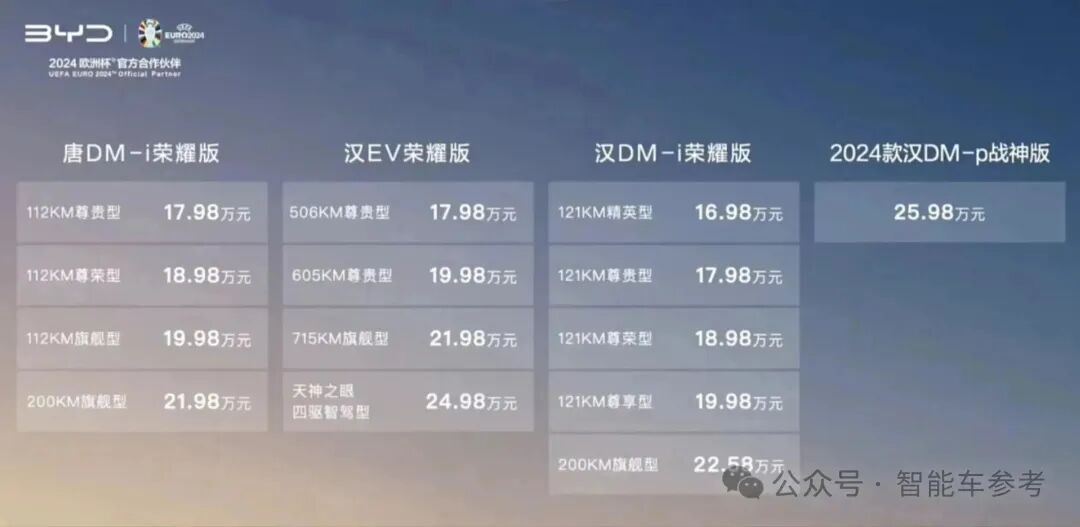 当然这轮价格中,表现最抢眼的还是率先出牌的比亚迪。最近接连推出汉、唐、宋、海豚、海豹系列等多款车型荣耀版。