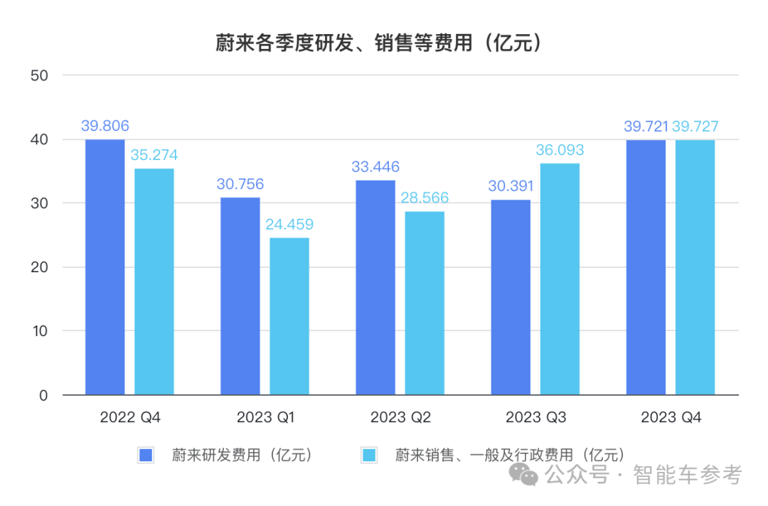 Q4蔚来在研发费用方面花了39.721亿元,和去年同期基本持平,比上一季度增加30.7%;同时销售等费用也同比增加12.6%,达到39.727亿元。