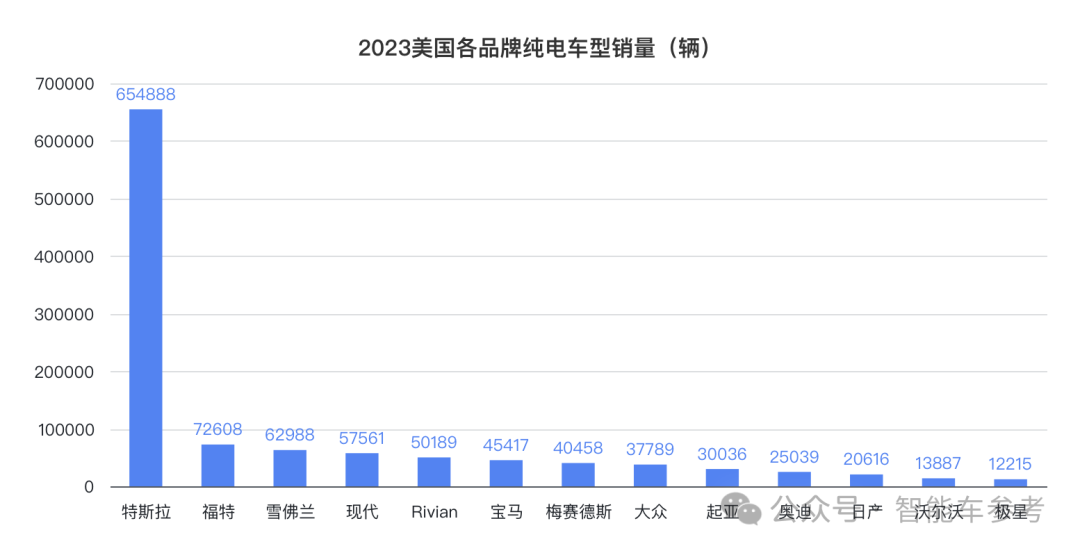 并且在2023年美国最畅销纯电车排行榜中,一款宝马的车都没有,而都是特斯拉、雪佛兰、Rivian这些满足宝马“百亿补贴”条件的产品。(来源:Statista)