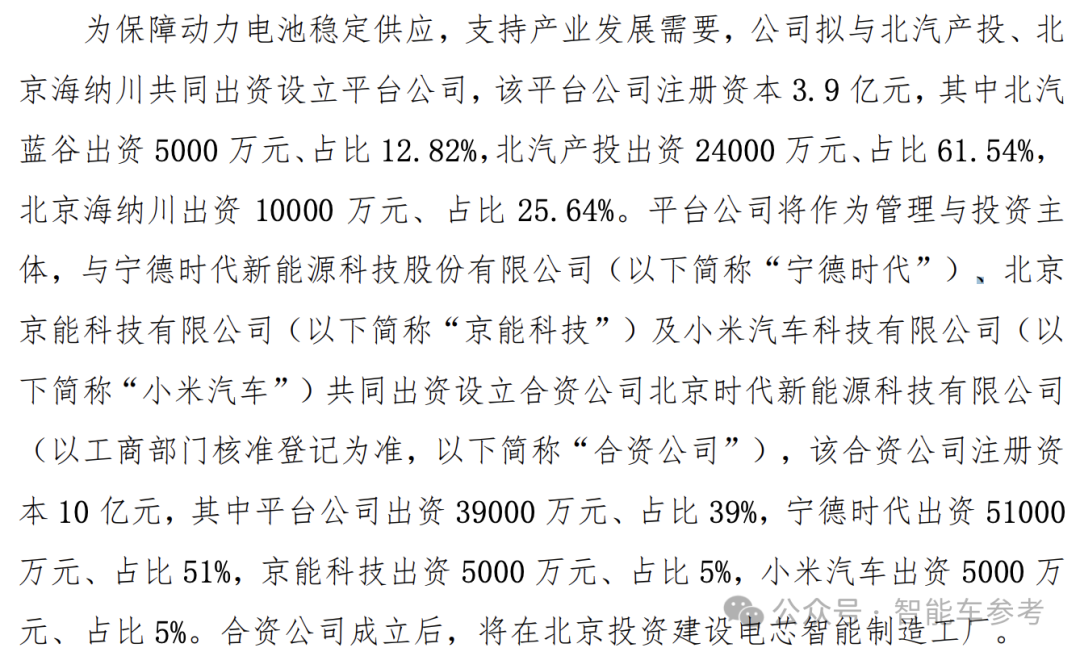 最新公告披露,宁德时代、北汽、京能科技和小米汽车共同出资10亿元,开建工厂,落地北京。