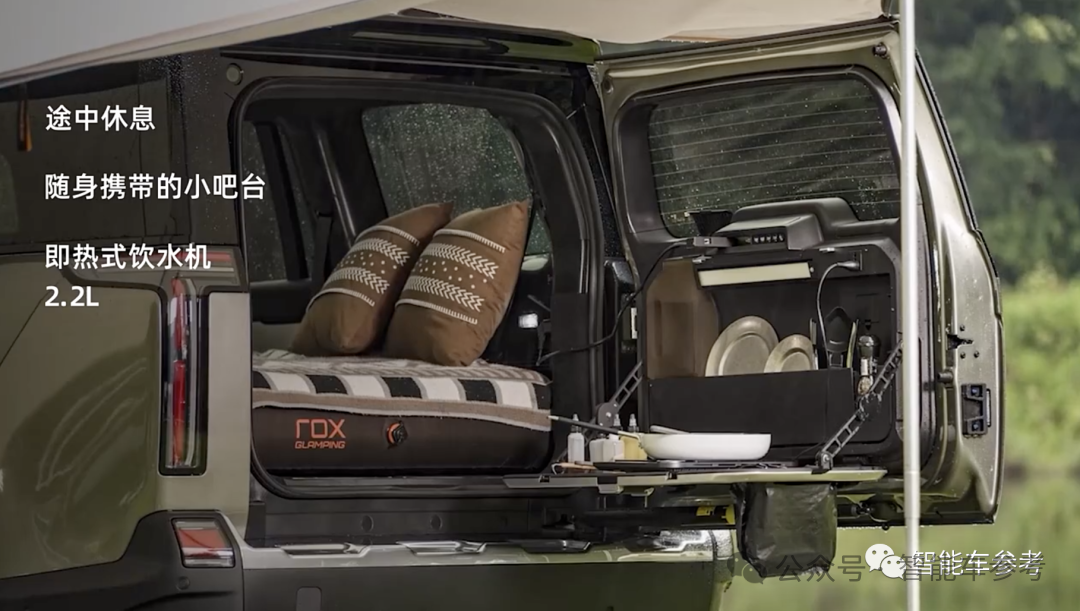 然后实用性方面,车内座椅折叠后,可形成一张大床,假期自驾游出门,房费都省了,尾门还有餐厨系统,可以自己做饭,平时野外露营很舒服。