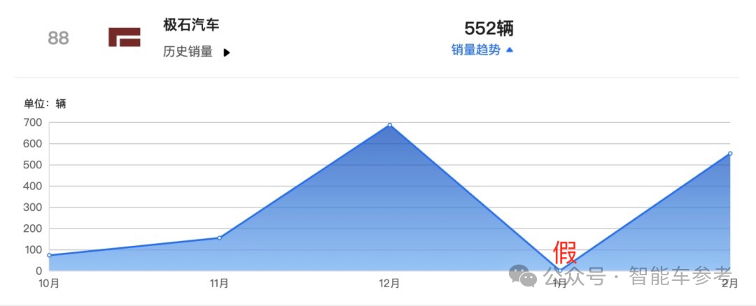 此前因为不明原因,某平台统计极石汽车的数据出了问题,其他3个月的销量还算正常,1月数据却是0。