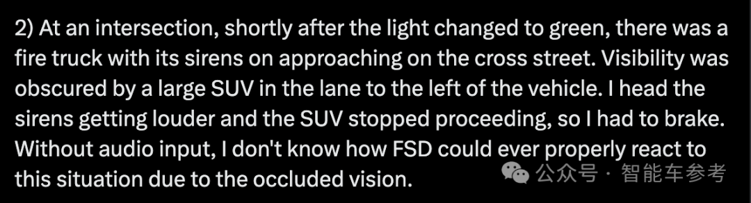 在视野遭到遮挡的情况下,系统没能识别路口正有消防车驶来,因此车主接管、踩了刹车: