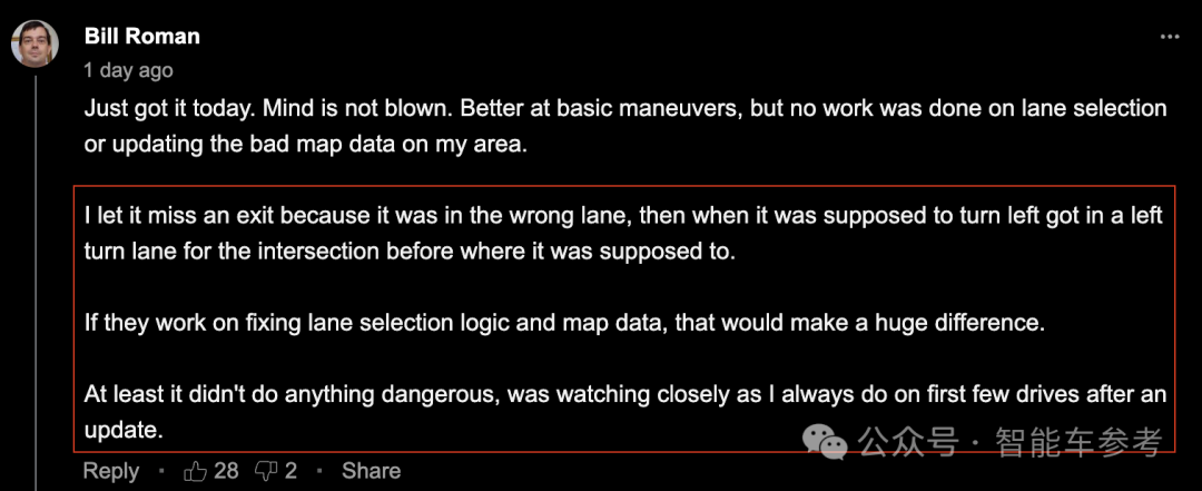 而且不止一位车主反馈新系统有时候会选错车道,导致绕远路或者后续需要接管。