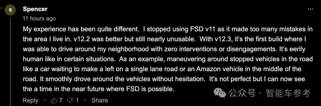 还有车主表示,原来自己在所在的社区从不用FSD Beta V11,因为经常出错,但是FSD Beta V12.3让他体验到了有史以来第一次“零接管”,而且系统在很多情况下都像人类,比如等待单车道上左转的车辆,或者马路中停下的送货车。