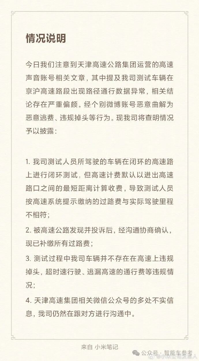 小米公司表示,测试车辆因为是在高速公路上进行闭环测试,所以导致高速计费系统计算的距离和实际行驶里程不一致,现在公司已经补缴过路费。并强调除此以外没有其他违规行为,同时还指出天津高速发布的内容有多处不实之处。