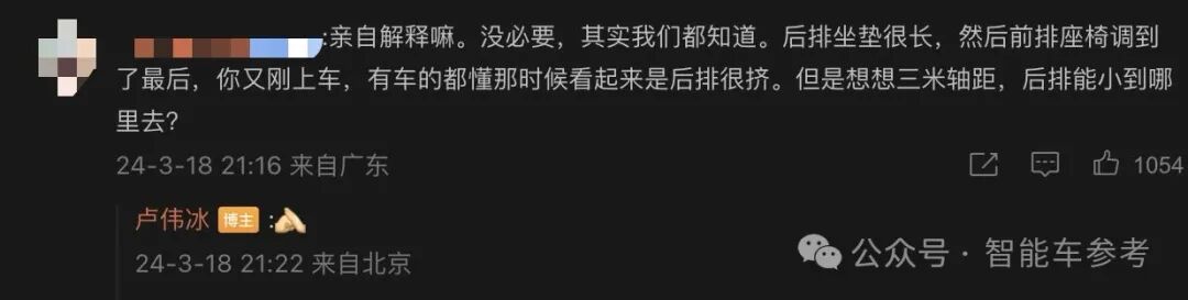 所以卢伟冰的澄清视频一出,立刻就有网友表示理解,认为都能看出来当时卢总上车的时候座椅调到了最后,对于后排来说自然很挤,但是三米轴距的车,后排能小到哪里去?