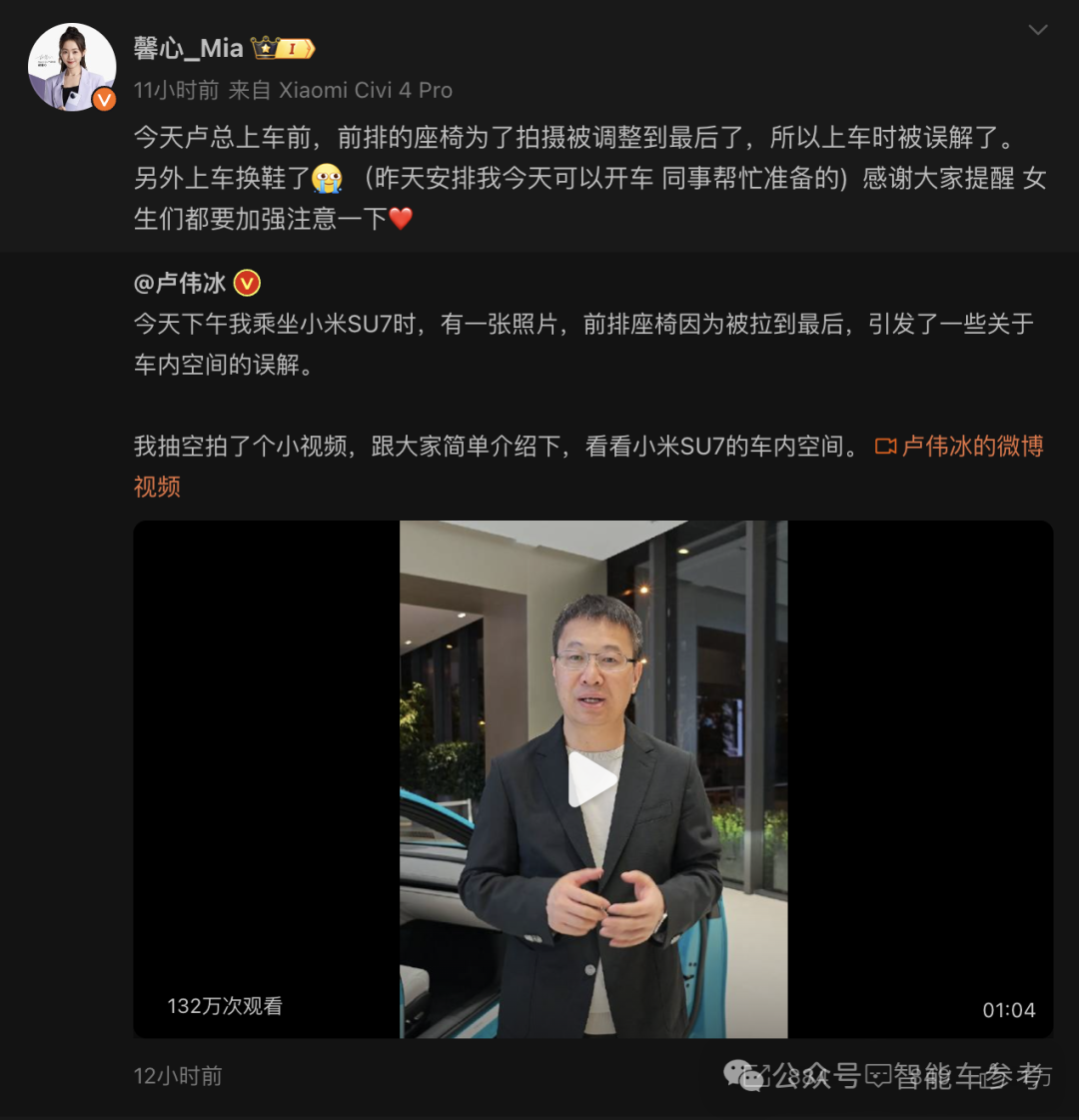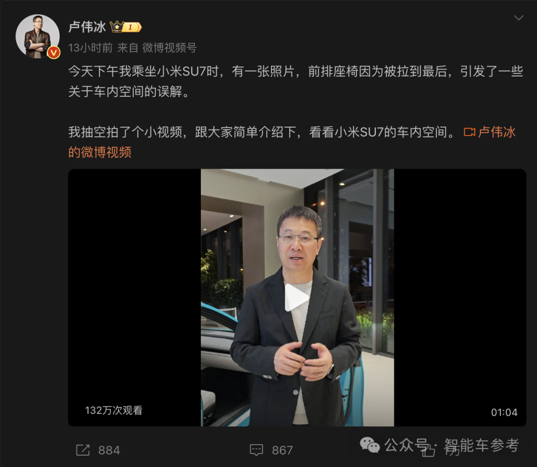这让卢伟冰连夜发布澄清,晚上十点多上线发了个视频力证小米SU7空间宽敞。