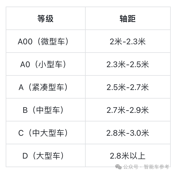 虽然具体每一等级的轴距长短网上众说纷纭,比如按照大众给出的数据,等级是这么划分的: