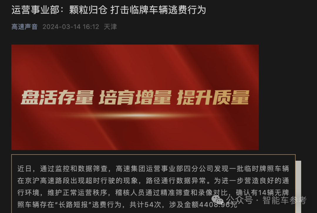 天津高速表示,公司发现了一起涉及14辆无牌照车辆的“长路短报”逃费行为,这些车辆一共逃了54次,累计金额达到4408.96元。