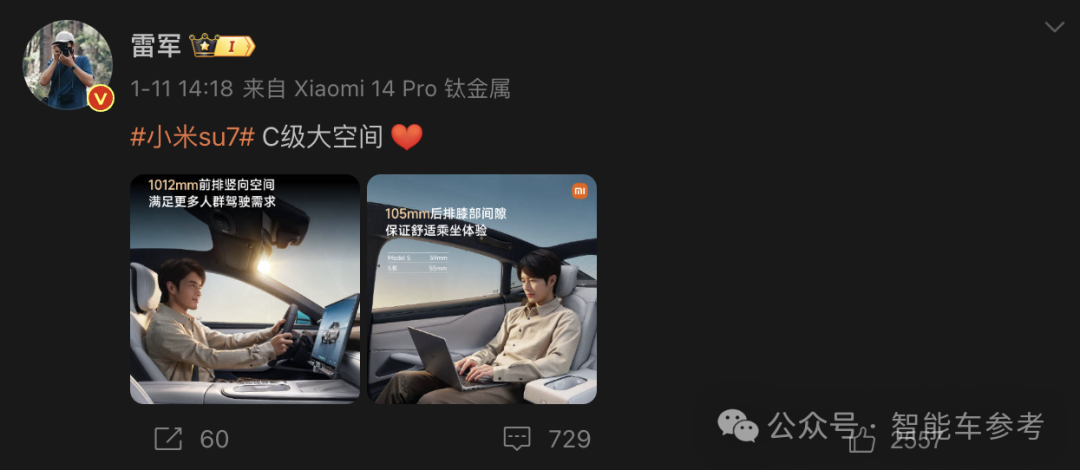 雷军也被惊动了,亲自上线辟谣,表示SU7是C级轿车,二排腿部空间比Model S和标轴宝马5还要大,大家不用担心后排空间不足。