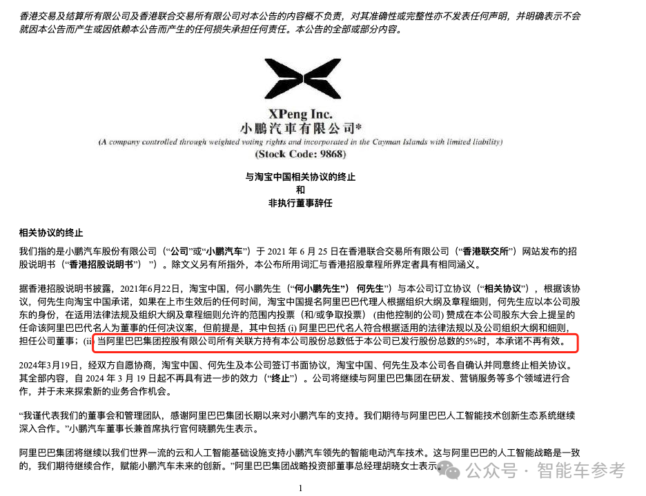 根据公告内容,此前淘宝中国、何小鹏与小鹏汽车三方订立协议,协议内容对阿里提名的董事人选有两项要求,其中一项是阿里巴巴所有关联方持有小鹏股份不能低于5%。