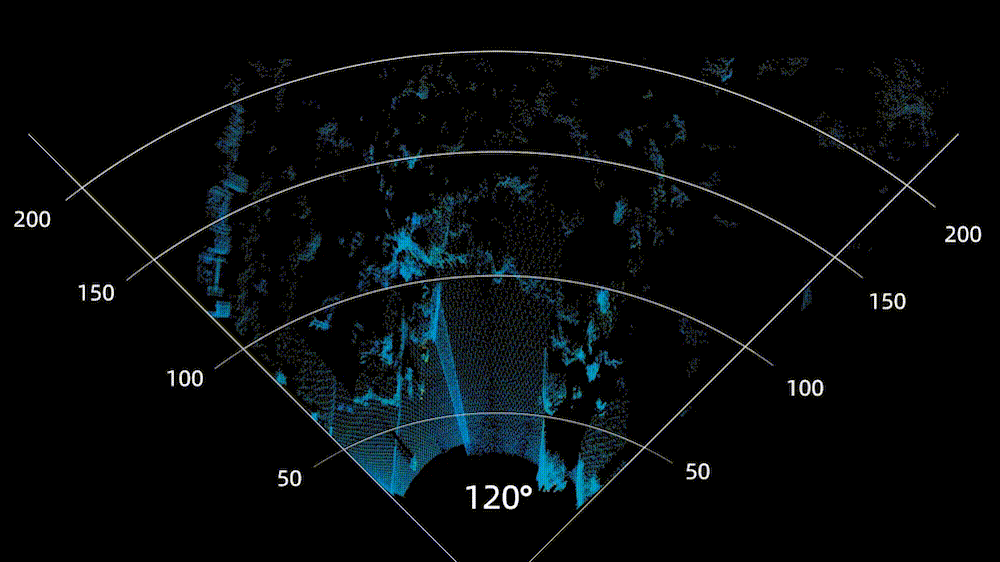 视场角为120度x50度,线束达到150线,水平方向最高生成360个像素点。